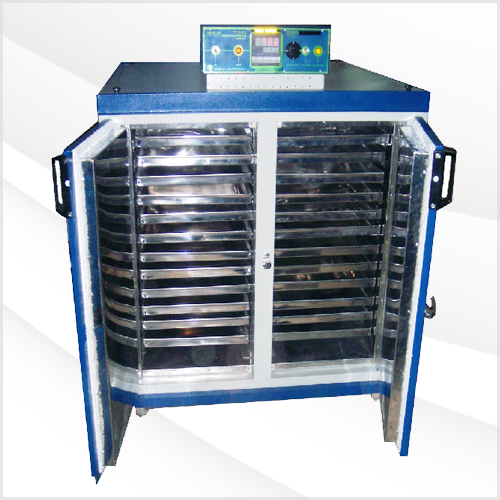 Double walled construction inner made of STAINLESS STEEL and outer made of thick M.S. duly powder coated paint. The Tray Dryer is heavily insulated with glass wool insulated material. The door is also insulated and provided with insulated gasket to prevent hot air leakages. Motorized forced air circulation is provided for uniform temperature and air circulation every level.